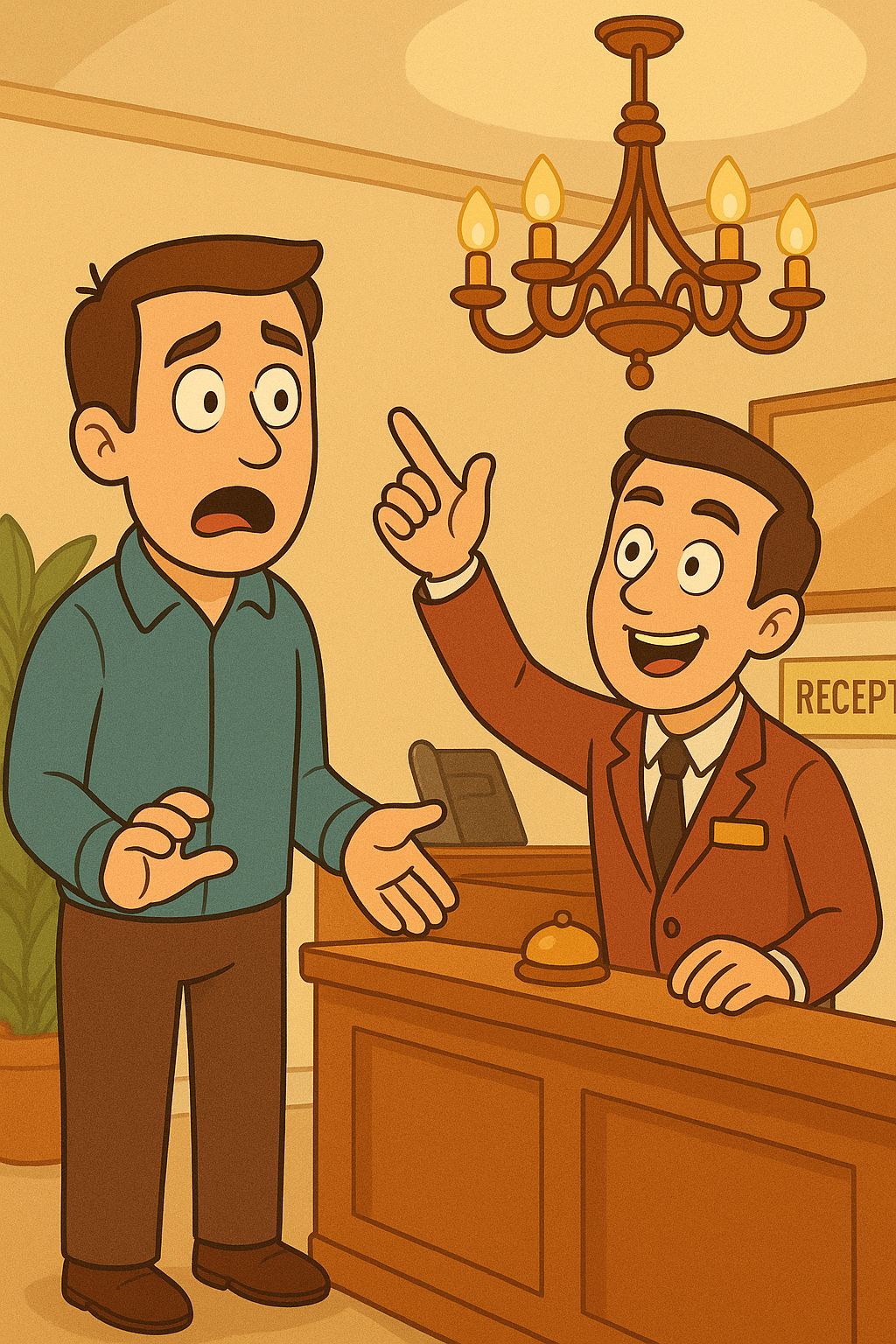 The next morning, they head to the front desk to check out of their room.
